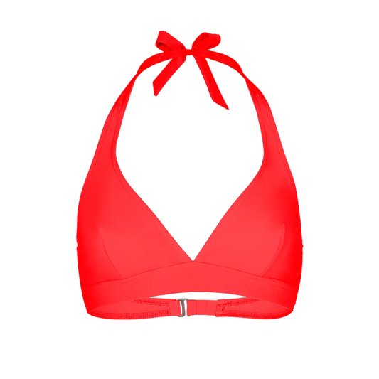 Soutien-gorge triangle couvrant avec bretelles à nouer dans le cou et fermoir dos à trois niveaux. Bande sous la poitrine, armatures côtés et pinces poitrines.