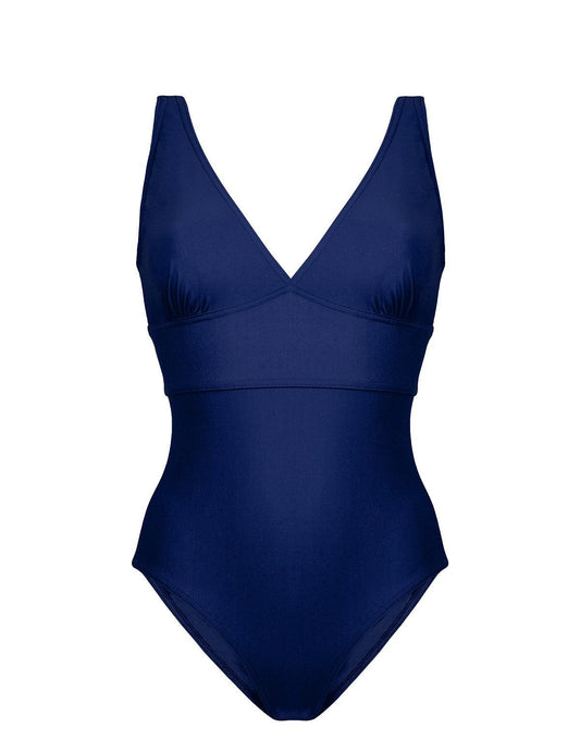 Maillot une-pièce triangle aux décolletés V symétriques devant et dos, avec découpe à la taille et fronces sous la poitrine. Culotte légèrement échancrée.